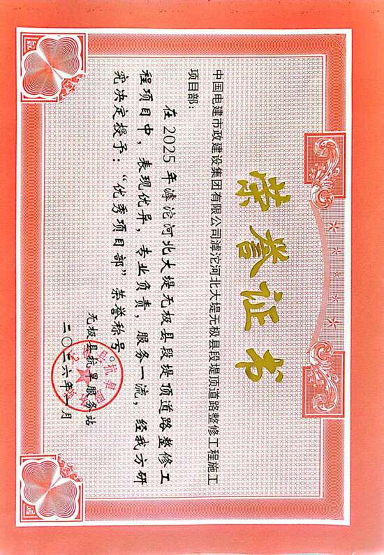 日前,河北省滹沱河北大堤无极县段堤顶道路整修工程施工项目获“2025年度优秀项目部”荣誉称号,项目员工宋守章、张建军获“2025 年度优秀参建个人”荣誉称号。 该工程位于河北省石家庄市无极县,全长7.8公里,是保障区域防洪安全、改善群众出行的重点民生工程,主要建设内容包括道路拆除重建、排水槽修缮、护坡修复以及交通、照明等配套设施安装。项目建成后,原有道路存在问题得到彻底解决,堤防防洪保障能力和道路通行质量实现全面升级。 自项目启动以来,项目部全体人员攻坚克难、实干争先,克服线性工程点多面广、交叉作业协调难度大等挑战,以精细化管理为抓手,统筹推进施工组织与质量管控,最终实现375个单元工程全部合格、优良率达96%、原材料及实体质量抽检合格率100%。同时,项目团队高效完成设计变更优化,高标准实现建设目标,工程最终获评“优良”等级,并通过多方联合竣工验收,实现全部资金回款,完成工程建设与经营收尾双重任务。 |