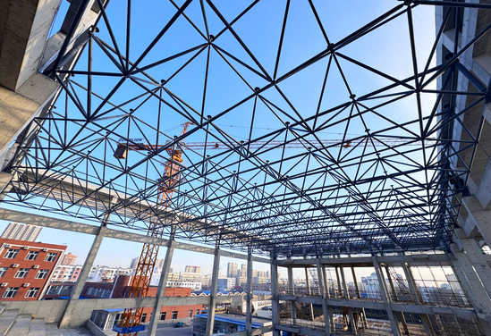扎鲁特旗第一中学多功能教室项目钢结构屋面球形网架吊装完成 |