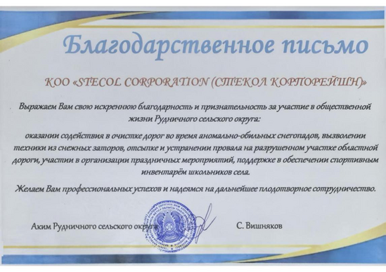 近日,哈萨克斯坦阿拉木图州鲁德尼奇1号和2号水电站建设项目部收到来自鲁德尼奇村的感谢信。