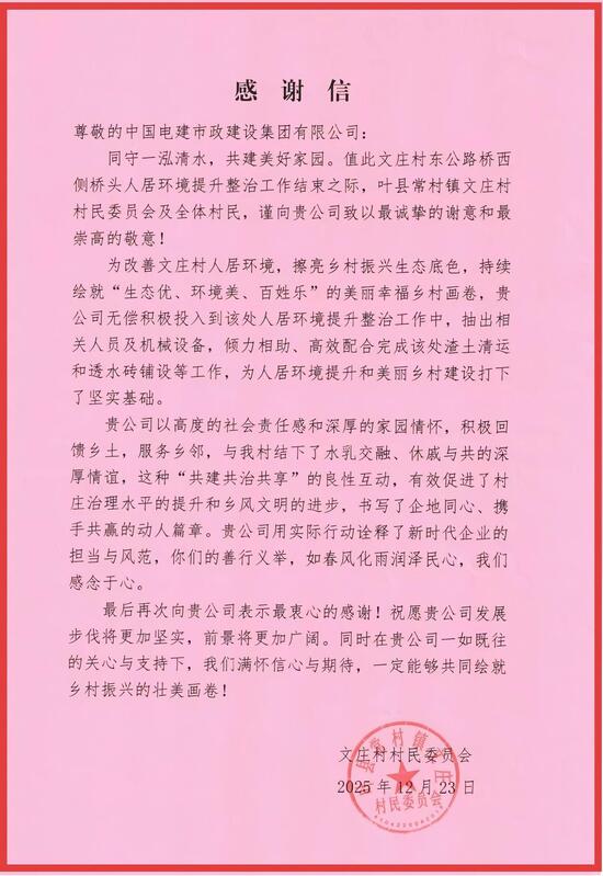 日前,水环境公司南水北调中线叶县鲁山维护项目部收到一封来自叶县常村镇文庄村村民委员会的感谢信。信中对项目部积极参与该村人居环境整治工作表示认可与诚挚感谢,字里行间饱含着村民们的真挚情谊。 不久前,文庄村推进人居环境提升工作,项目部得知后,主动响应、迅速行动,将其视为助力乡村振兴、履行社会责任的重要契机。在确保主业工程顺利推进的同时,项目部统筹协调,抽调精干力量与适用机械设备,无偿支援文庄村东公路桥西侧桥头的环境整治。项目团队与村民们携手协作,高效完成渣土清运、透水砖铺设等任务,显著改善了当地村容村貌。 整治后的区域整洁美观、焕然一新,赢得了村民们的广泛好评与满意笑容。此次行动不仅是一次义务劳动,更是“共建共治共享”理念的生动实践。通过共同劳动,项目部与文庄村结下了深厚情谊,也亲身参与到美丽乡村建设的进程之中。 这份来自乡亲们的认可,是对项目部全体人员的莫大鼓励。项目部负责人表示,将继续秉承央企社会责任,在打造优质工程的同时,积极融入地方发展,以实际行动为乡村振兴注入更多力量,书写企地同心、共促发展的新篇章。 |