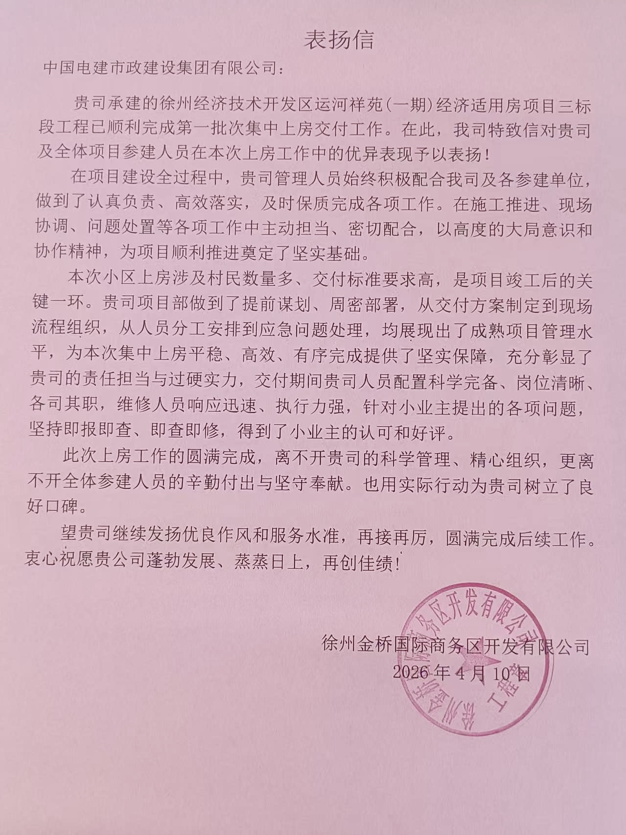 徐州运河祥苑安置房项目收到建设单位表扬信 |